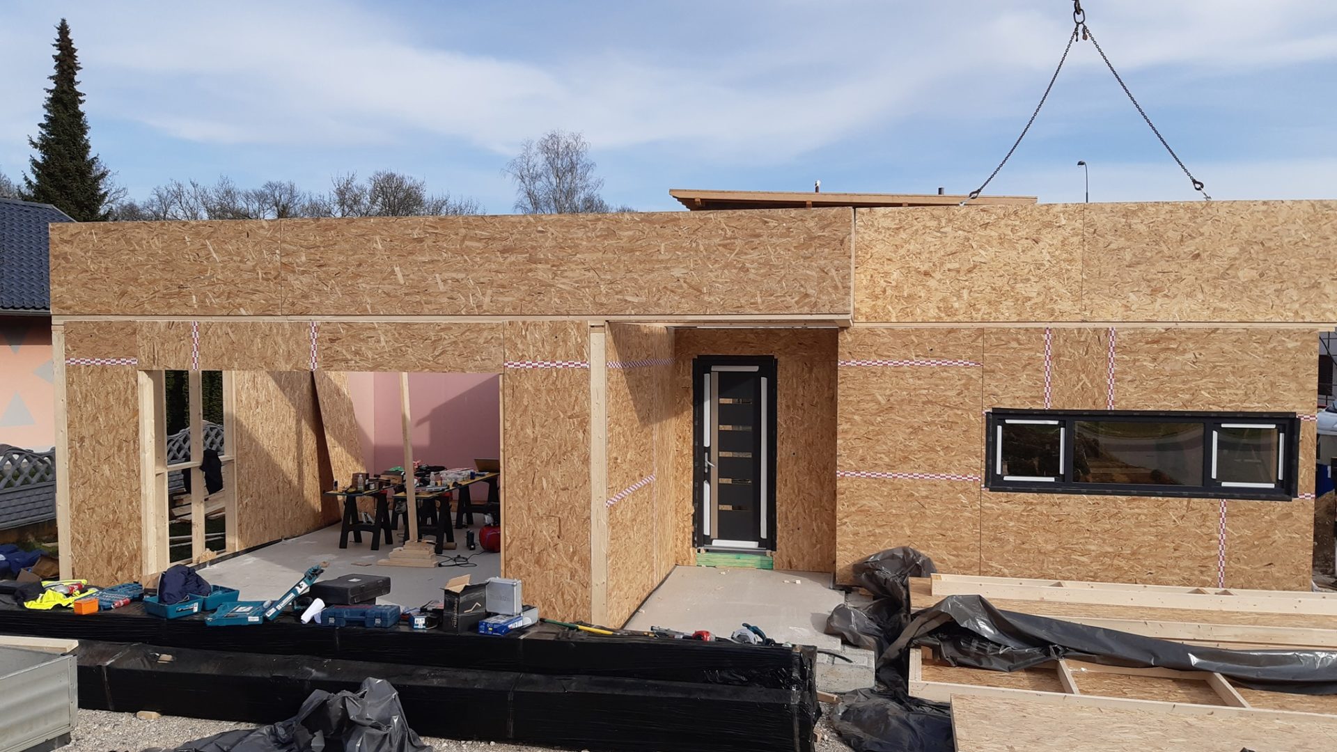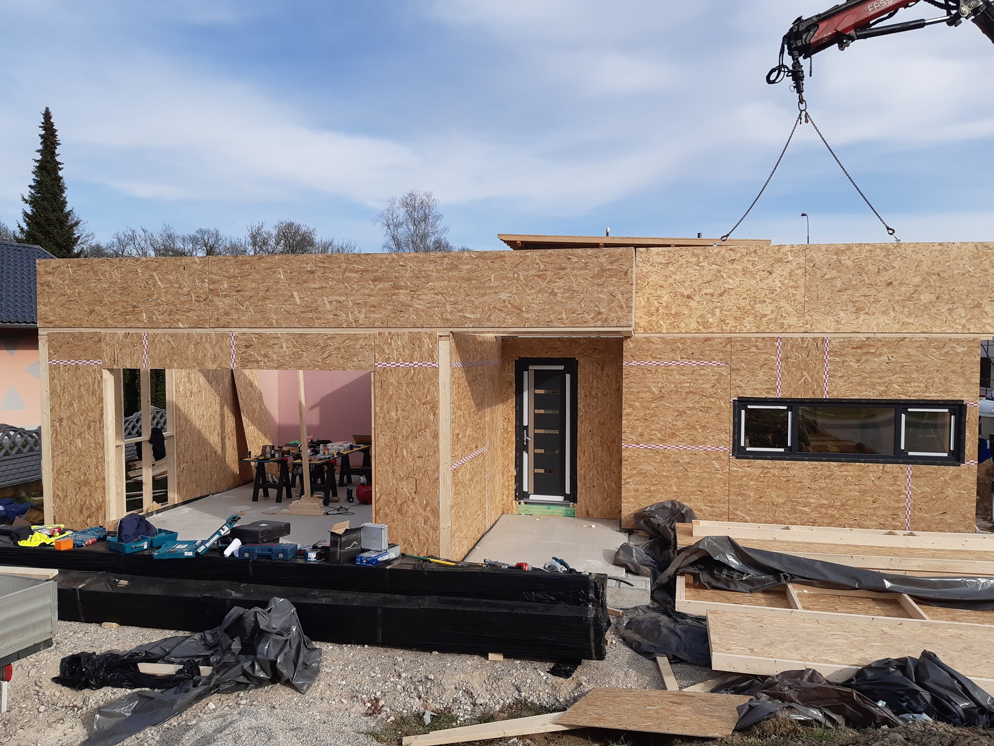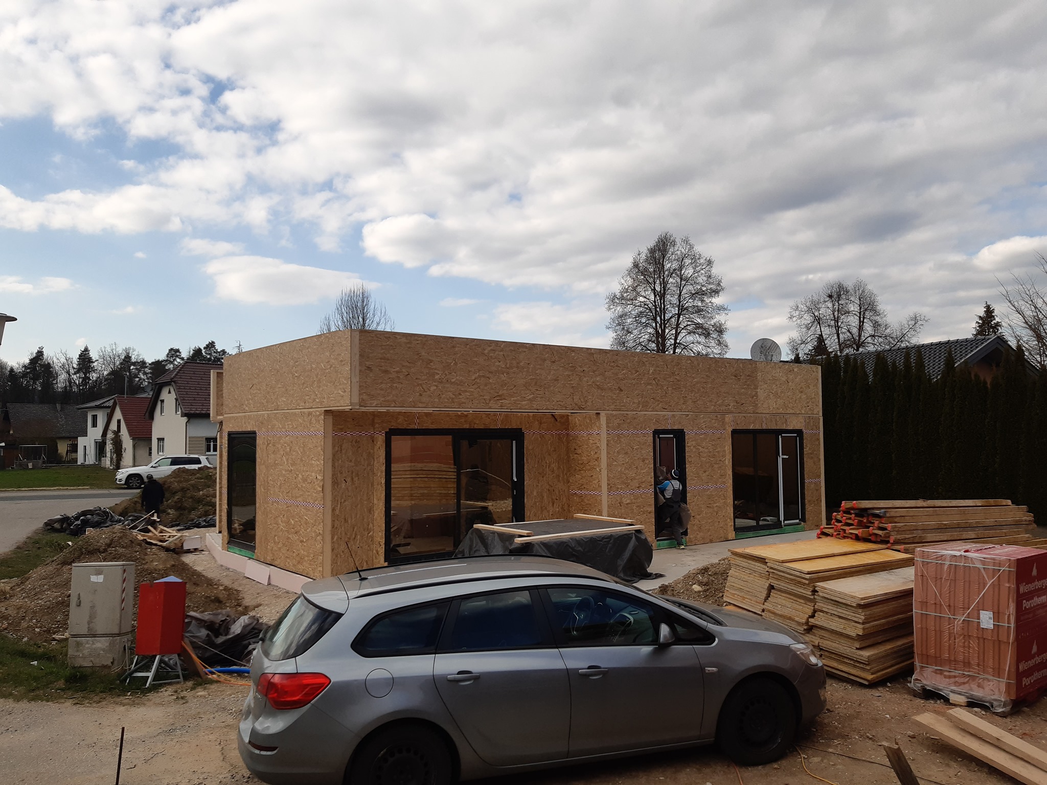 O casa pe structura de lemn, facuta la rosu urmand ca finisajele sa le realizeze beneficiarul. Casa are o suprafata desfasurata de 111 m2. Peretii au fost prefabricati la noi in hala, inchisi pe ambele parti cu osb si sigilati cu banda.